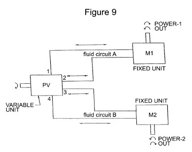 FIG. 9 shows the schematic connection of one variable device to two fixed hydraulic motors, utilizing the Siamese ports of the invention to drive two separate outputs. This connection will allow the differential feature of the invention to be in use to differentially drive the two motors so as to effect a differential drive to the motor outputs, which is the case in a vehicular axle set negotiating a turn.