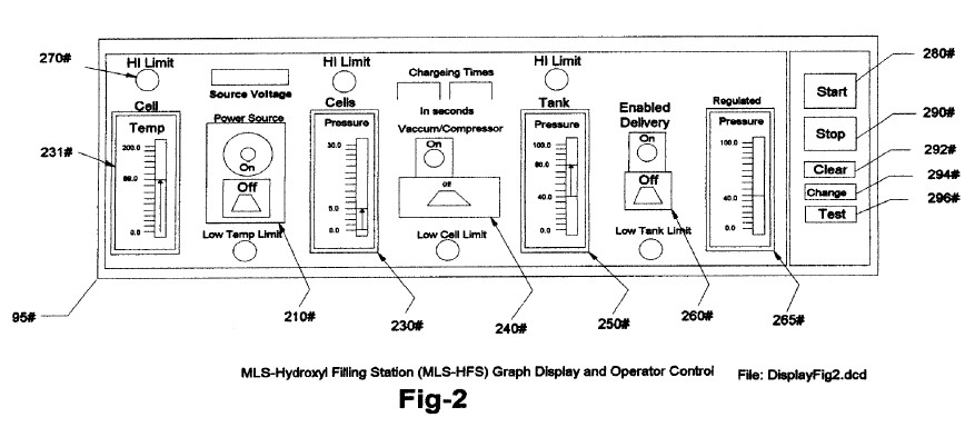 [0016] FIG. 2 shows the layout and functions of the operator control display 95 emulating from program 75 FIG. 1. It consists of cell temperature indicator 231 FIG. 2 cell power activator 210 cell pressure indicator 230 vacuum controller 240 hi-pressure tank indicator 250 delivery controller 260 delivery regulated pressure indicator 265 and related alarm/status indicators 270. Also software control buttons are provided to start 280 stop 290 clear data 292 change setting 294 and testing of equipment and their sequences 296.