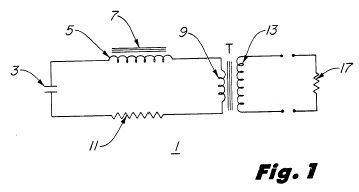 Referring now to Figure 1, an equivalent electrical circuit of a nuclear battery constructed according to the principles of the present invention is shown. An LCR circuit 1 is comprised of a capacitor 3, inductor 5, transformer T primary winding 9 and resistance 11 connected in series. It is assumed that the electrical conductors connecting the various circuit elements and forming the inductor 5 and primary winding 9 are perfect conductors; i.e., no DC resistance. Resistor 11 is a lump resistance equivalent to the total DC resistance of the actual circuit components and conductors. The inductor 5 is wound on a core 7 which is composed of a mixture of radioactive elements decaying primarily by alpha particle emission.