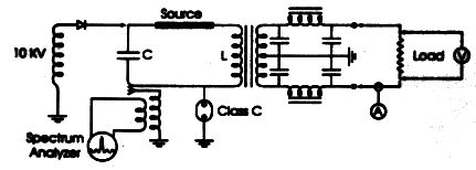 Once assembled and properly tuned, the device requires an electrical impulse to initiate the oscillation in the tank circuit. We have utilized two methods for this purpose (Figure 5): the first is simply a capacitive discharge device where an external capacitor is charged by an external source and discharged into the secondary (the output circuit) while the second method (Figure 6) utilizes a Class C amplifier with a charging source attached to the high side of the primary capacitor and the Class C amp is used to discharge the primary capacitor to ground at a rate equal to the fundamental frequency of the device. Figure 7 is the actual schematic of one successful design. Note the resemblance to a cold cathode oscillator, as this device also operates in a vacuum. Figure 8 is the component layout for the vacuum cell.