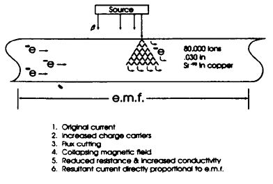 Additionally, flux cutting also occurs as the beta particle approaches the current carrying wire which yields an emf to help drive electrons (Ref. 9).