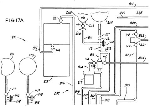 In the same manner, the potential on the ionization heads is increased by the addition of approximately 17% for a total of approximately 79% of the total calculated potential and then valve V30 is opened to admit argon into the mixer via port 243. This gas passes through branch B34, ionization head 239, and branch B33 into mixing chamber 261. Again, when the proper amount of argon has been admitted, it emits a spectroscopic flash of light and the operator closes valve V30. Next, the potential on the ionization heads is increased by the addition of approximately 13% to result in a total of approximately 92% of the total calculated potential and valve V58 (see FIG. 17D) is opened to admit krypton into the system. The krypton gas passes through branch B51, ionization head 271 and branch B48 into chamber 261. Upon the emission of a spectroscopic flash of light by the gas, the operator closes valve V58. Finally, the potential on the ionization heads is increased by the addition of approximately 8% which brings the ionization potential to the full 100% of the calculated ionization voltage and valve V56 is opened to admit xenon into the mixer via port 279. This gas passes through branch B50, ionization head 273 and branch B47 to the mixing chamber. When the proper amount of gas has been admitted, a spectroscopic flash of light occurs signalling the operator to close valve V56. Note that there are two filter/absorber units, labelled 253 and 291. Unit 253 is connected to the neon and argon inlet branches B33 and B35 while unit 291 is connected to the krypton and xenon inlet branches B47 and B48. These two units absorb hydrogen residue and immobilize the water vapor created when the pump circulates the gases and generates vacuum states.