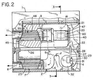 As enthalpy transfer ring 25 continues to rotate, so that said portion thereof departs from the spin nuclei polarizing effect of the kinemassic field flux lines of zone 10, the specific heat will increase again to its normal value thereby causing the temperature of said given portion to drop below that value existent prior to entering zone 10 because of the reduced enthalpy now contained therein. The lower stream of air is forced from duct 6 through those tubular channels 55 in the reduced-temperature heat flow zone 7 with the result that said given portion of enthalpy transfer ring 25, due to its changed state of increased specific heat, will absorb heat from the ambient flowing air, as said given portion of ring 25 reaches zone 7, the result being that the air emerges from outlet 8 with a temperature lower than that temperature possessed when it was flowing through duct 6. IT will be noted, as can be seen from Figure 2, that the increased-temperature heat flow zone 10 is offset, with respect to the vertical, from reduced-temperature heat flow zone 7, this offsetting being desirable for optimum coordination of the specific heat reduction and recovery times respectively of the chosen material forming ring 25 in its passage into and from the zone 10. The positions and configuration of zones 7 and 10 may be varied depending on the specific heat properties of the material forming ring 25.
