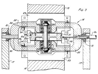Shown mounted on the horizontal structural element 11 is the kinemassic force field generating apparatus indicated generally as 10, the lower portion of which is referred to as the lower mass member 12. The lower mass member 12 is not to be confusingly associated with the mass circuit mentioned above as being positioned in the space experiencing the secondary gravitational field. The nature and specific identity of the latter mentioned mass circuit will be more fully explained in connection with the explanation of Figure 7.