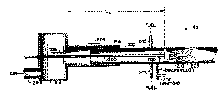 [0006] To burn, the fuel must first mix with an oxidant such as air. The resulting mixture must then be supplied with sufficient heat and, if possible, free radicals, which are highly reactive chemical species such as H, OH and O, to ignite. Once ignition occurs, combustion is generally completed within a very short time period. After initial ignition, combustion proceeds via an internal feedback process that ignites the incoming reactants by bringing them into contact within the combustor with hot combustion products and, on occasion, with reactive gas pockets produced by previously injected reactants.