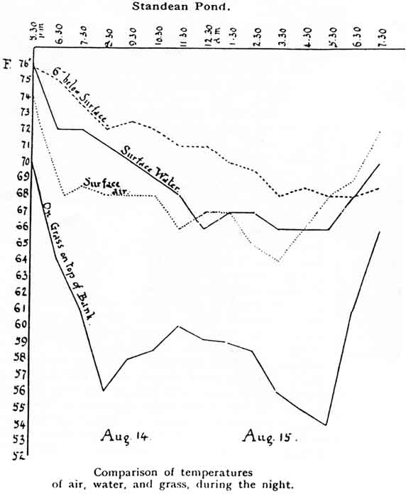 All my observations, went to show, as was to be expected, that the temperature of water of a pond rarely went down below dew-point during the night. In hot summer weather, when with the accumulation of heat the temperature of the water gradually rose in the day-time, there was insufficient time during the short summer nights for radiation to proceed to such a degree that its temperature went down below dew-point. The specific heat of water is, of course, very great, and its changes of temperature are very gradual, whereas changes on the grass, on the dry bank of a pond, and in the atmosphere, are more rapid.