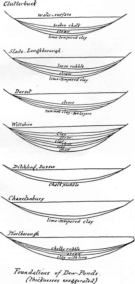 ... that a thick layer of damp straw spread over the puddled clay would prevent its drying and cracking before the pond filled. It might also act as binding. The straw would rot eventually, but once the pond filled this would not matter. Some ponds have a bottom layer of chalk or lime, about 50mm (2") thick, which may serve to keep earth-worms from penetratinDesign</h3> Dew ponds occur mainly on porous soils where the rainfall is about 1m (40") per year, and the annual evaporation from a body of open water is in the range of 450mm (18"). The traditional dew pond design ensures an adequate water supply from rainwater alone, by maximising the pond's catchment area in relation to its evaporation area. The average dew pond is about 18m (20 yards) across its water surface with a further collection margin of at least 3.6m (4 yards).