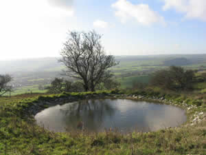 Dew ponds are actually fed by rainwater and they are normally situated in a slight depression so that there is a reasonable sized catchment area for rain. The amount of dew falling in a year is around half an inch whereas the rainfall will be between 30 and 40 inches a year. The water retention properties of the dew ponds lay in their making and the appreciation of the margins of the pond as a catchment area. The bottom layer of the pond was puddled chalk or clay, which was normally covered by straw, laid as it would have been on a thatched roof. This was then covered by a mixture of loose materials such as chalk rubble, sand, flints or gravel.