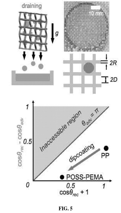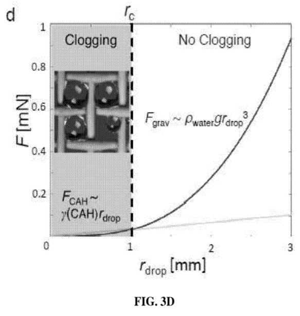 [0035] FIGS. 3A-3E represent two factors that reduce collection efficiency, and the surface modification design space that depicts the relative resistance to re-entrainment and drainage. Two factors that inhibit fog harvesting and reduce collection efficiency are ( FIG. 3A) re-entrainment of collected droplets in the wind and ( FIG. 3B) blockage of the mesh. FIG. 3C shows a plot that identifies the range of droplet sizes where the forces of adhesion dominate the drag forces, and establishes a criterion for a threshold droplet size for re-entrainment. FIG. 3D shows a plot that represents a second constraint arises from comparing the weight of the droplet with the surface pinning force arising from contact angle hysteresis. The threshold size where gravity dominates hysteretic pinning can be decreased by minimizing CAH=cos θ rec−cos θ adv. FIG. 3E shows a graph depicting the design space constructed from two dimensionless parameters related to work of adhesion (abscissa) and contact angle hysteresis (ordinate) depicts the relative resistance to re-entrainment and drainage. Measured values for droplets of water (V ″10 μL) deposited on several different coatings are shown in the plot. Wetting characteristics corresponding to a higher work of adhesion and lower contact angle hysteresis are ideal for the maximum fog collection efficiency.