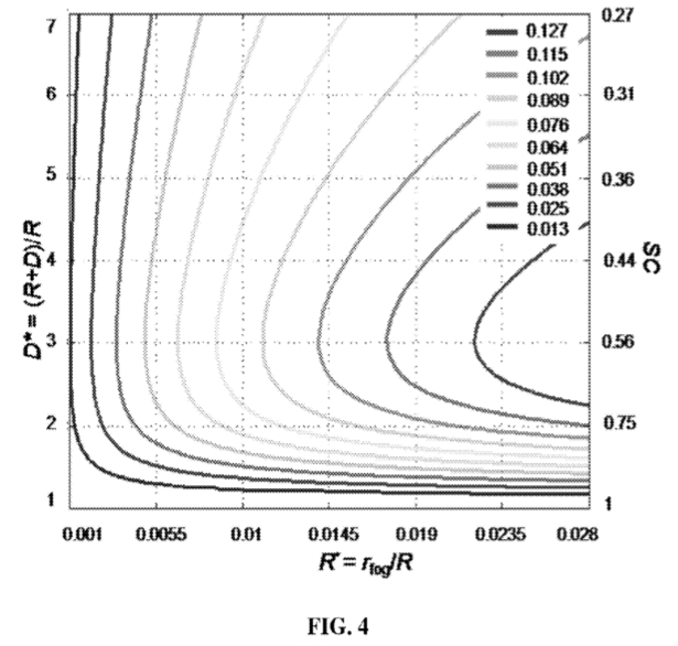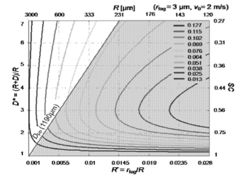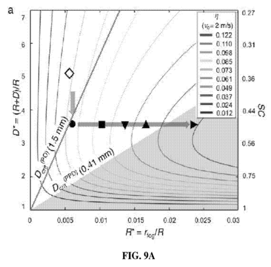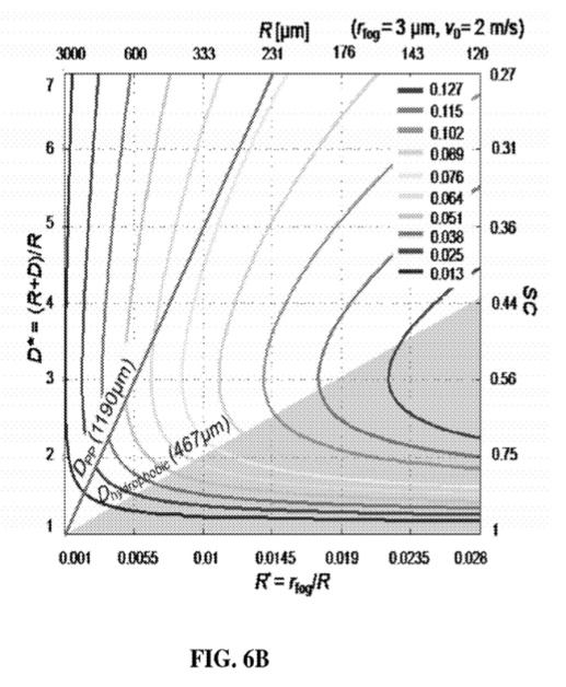 [0036] FIG. 4 is a contour map of the predicted aerodynamic capture efficiency of fog droplets of radius r fog using a mesh with a wire radius R and a spacing ratio D*, assuming a wind velocity of 2 m/s. The efficiency is expected to increase with decreasing R (increasing R*) and at an intermediate value of D*.