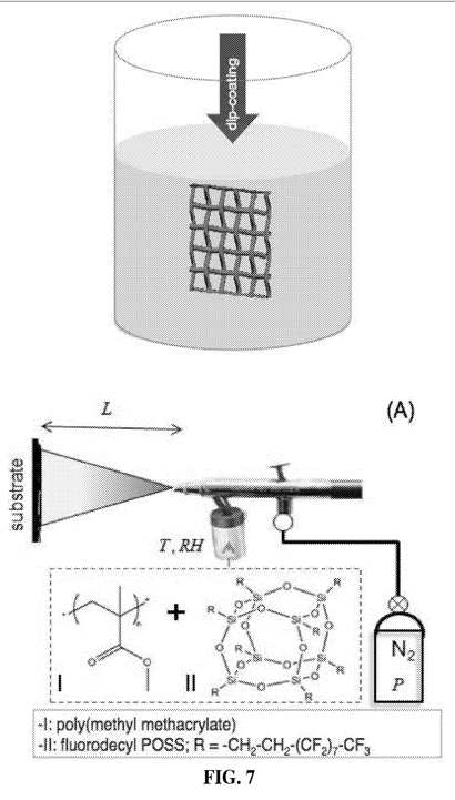 [0039] FIG. 7 illustrates a fabrication process of liquid-collecting permeable surfaces with different wettability by dip-coating and spray-coating.