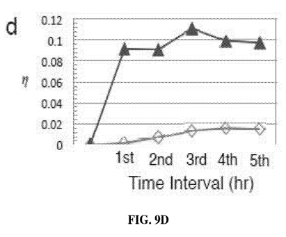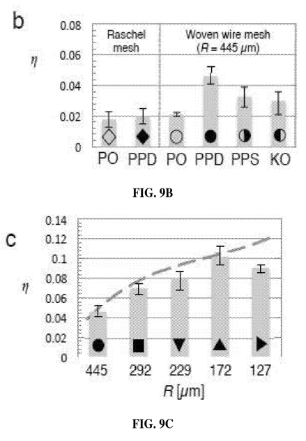 [0041] FIGS. 9A-9D illustrate results of fog harvesting experiments with woven wire meshes of different dimensions and surface coatings. FIGS. 9A-9C show design chart based on spacing ratio D* and dimensionless width R*. FIG. 9D displays the experimentally observed collection efficiency for the 5 dip-coated wire meshes along with coated and uncoated Raschel mesh.