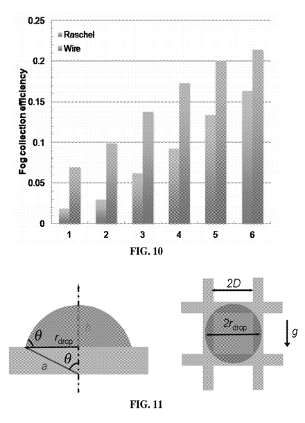 [0040] FIG. 8 is a schematic depiction of an artificial fog harvesting experimental setup. The experiments were carried out in a humidity chamber at T=26° C., and a relative humidity of 100% to eliminate the effects of condensation and evaporation of water.