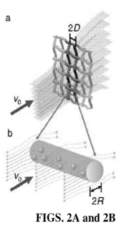 [0034] FIGS. 2A-2C are a diagrams depicting fog flow through a woven mesh surface, and a contour plot of the fog harvesting efficiency. FIG. 2A is an illustration indicating the stream surfaces of fog laden wind and their divergence after passing through a woven mesh surface. FIG. 2B is an enlarged drawing focusing on the interaction between incoming fog droplets and a horizontal mesh element. FIG. 2C is a contour plot of the fog harvesting efficiency (η) s a function of the ratio of radius of the fog droplets to the radius of the wire (R*=r fog/R) and the spacing ratio of the woven mesh (D*=(R+D)/R).