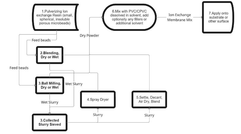 [0011] As illustrated in FIG. 1, the overall manufacturing process begins with commercial ion exchange resins, which are typically spherical beads (small, insoluble, porous micro-beads used, for example, in water softening). These beads are pulverized into fine powder using mechanical shearing methods such as grinding (step 2, dry or wet), ball milling (step 3, dry or wet), or other grinding techniques. Wet processes may include water to assist lubrication. If water is introduced, it is removed to obtain dry powder or a controlled slurry before further processing.