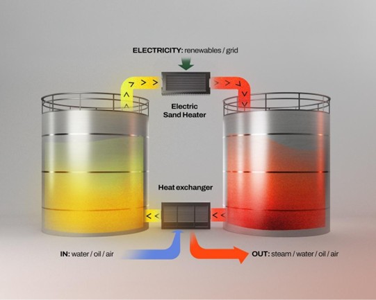 The principle of the sand-based heat storage is simple. The proprietary technology stores heat in ordinary sand using two insulated silos, an electric heater, and a heat exchanger.